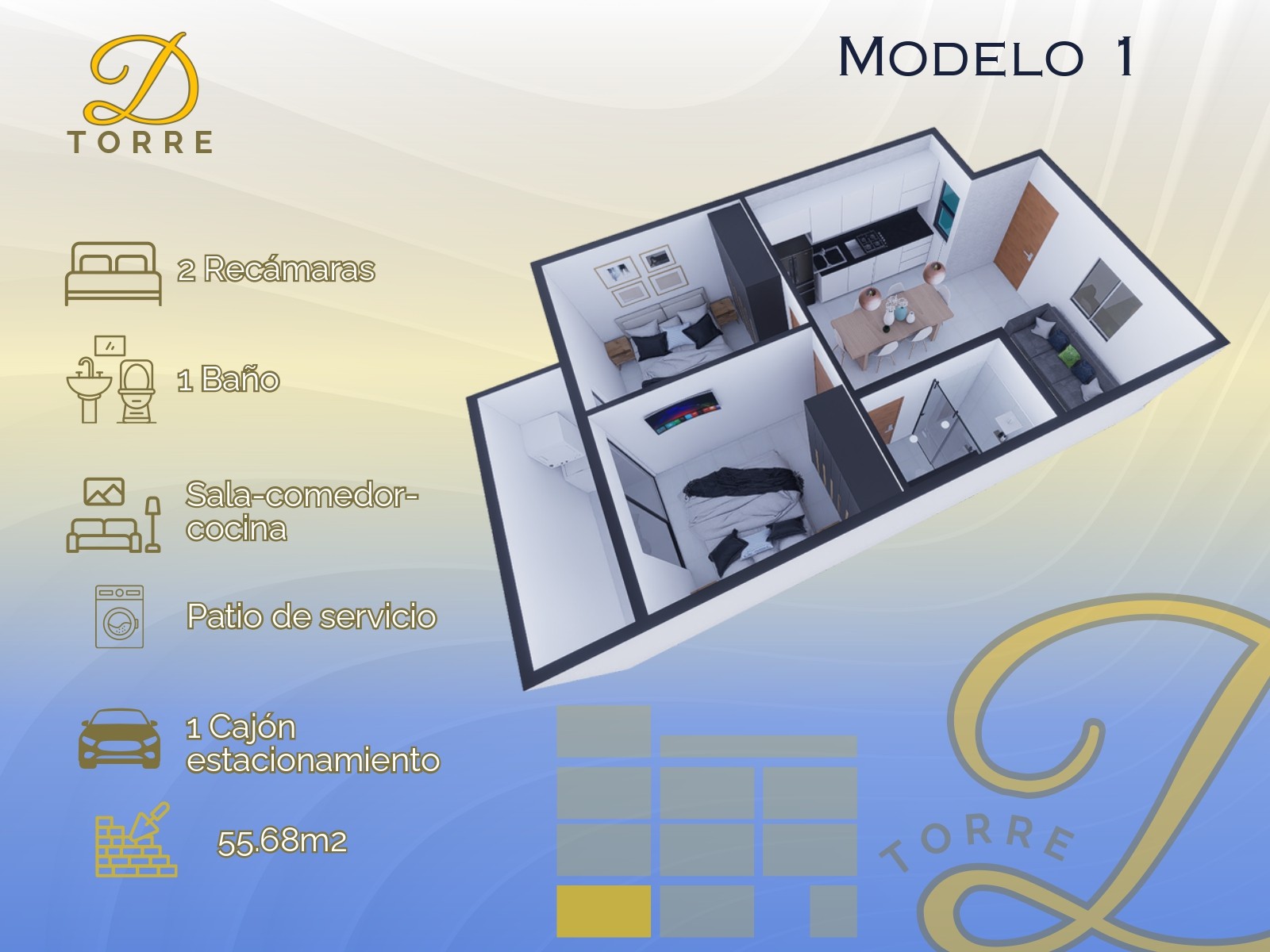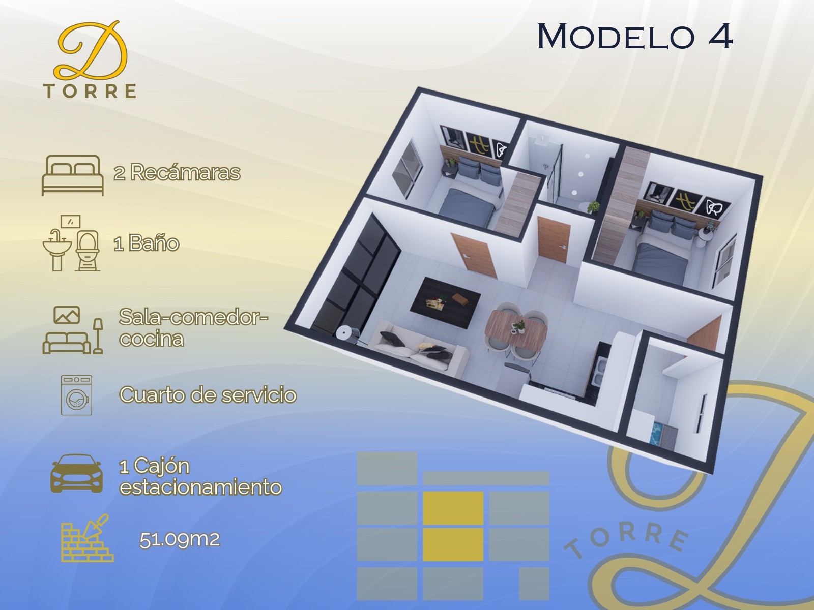 - 51.09 m2 - 2 Recámaras, 1 Baño, Sala-Comedor, Cocina, Cuarto de Servicio, Cajón de Estacionamiento.
