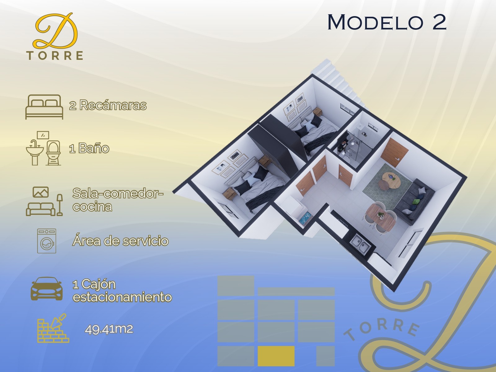 - 49.41 m2 - 2 Recámaras, 1 Baño, Sala-Comedor, Cocina, Área de Servicio, Cajón de Estacionamiento.
