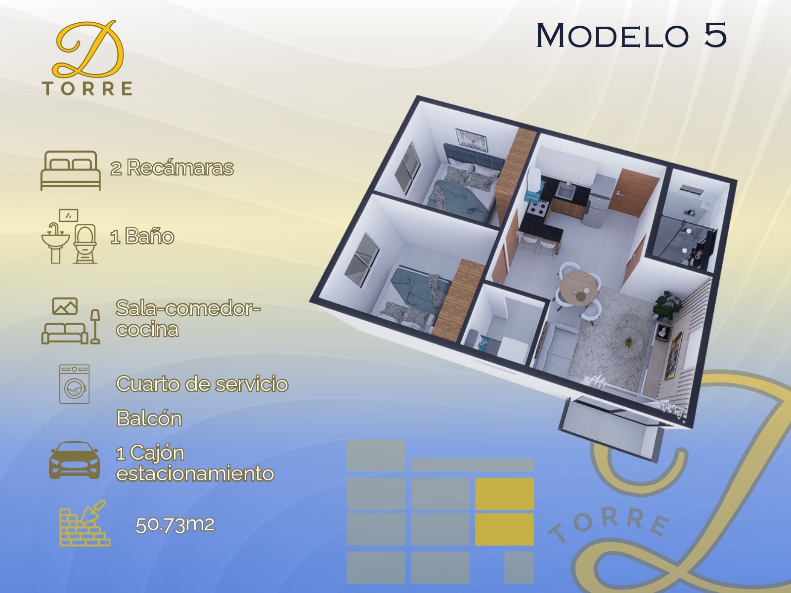 - 50.73 m2 - 2 Recámaras, 1 Baño, Sala-Comedor, Cocina, Cuarto de Servicio, Balcón, Cajón de Estacionamiento.