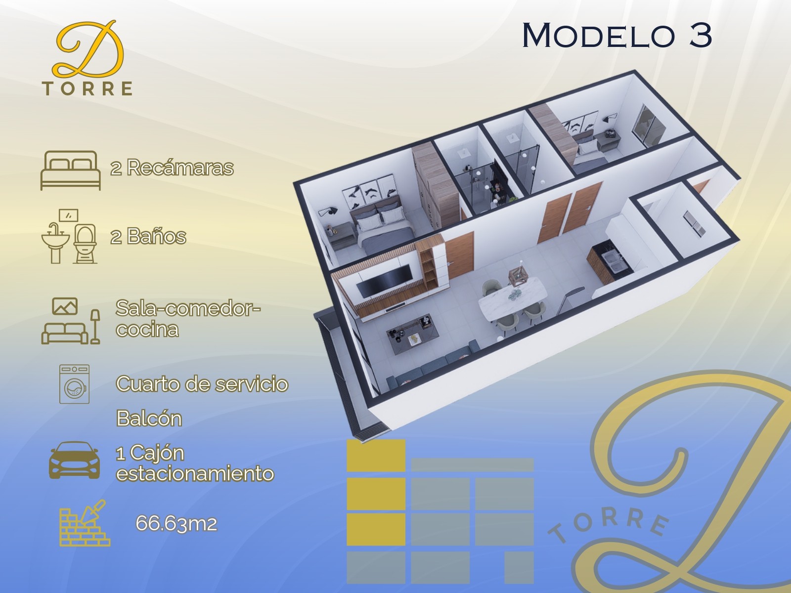 - 66.63 m2 - 2 Recámaras, 2 Baños, Sala-Comedor, Cocina, Cuarto de Servicio, Balcón, Cajón de Estacionamiento.